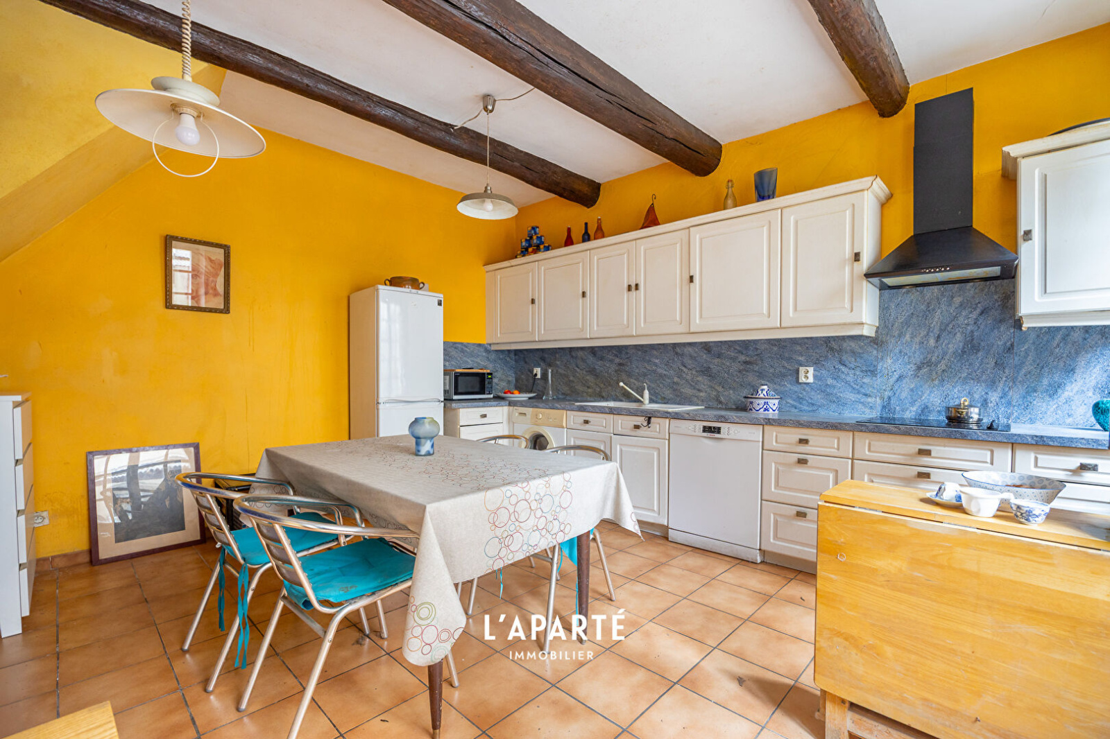 Au rez-de-chaussée, une cuisine fonctionnelle s'ouvre à la fois sur l'entrée et sur la cour privée de 47 m², un espace extérieur rare en plein coeur de Marseille, parfait pour des repas en plein air ou un coin détente.