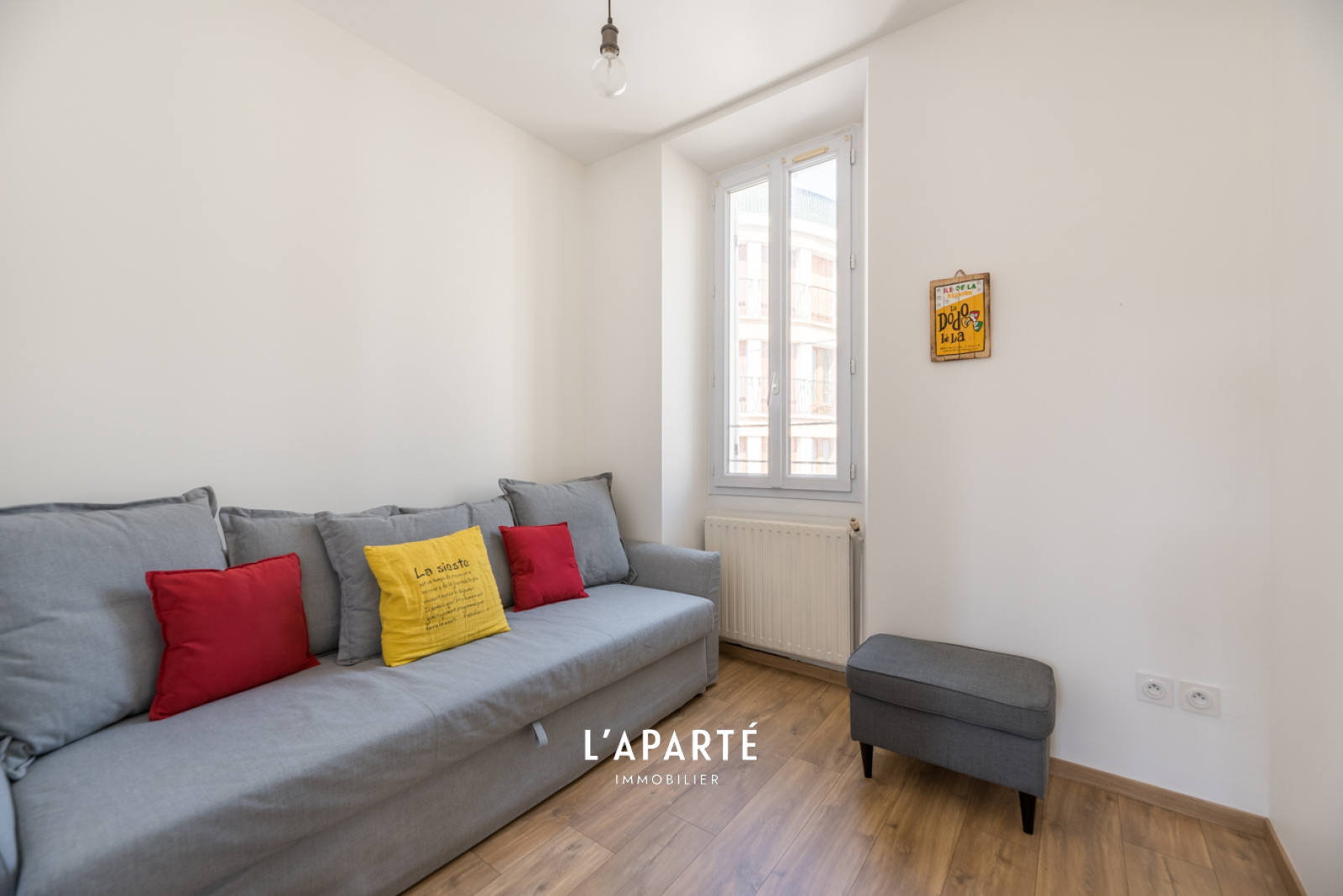 L'entrée se fait sur une très jolie pièce à vivre de 35m², dans laquelle vous découvrirez une cuisine semi-ouverte équipée, ainsi qu'un salon/salle à manger exposé sud avec de belles hauteurs sous plafonds et une excellente luminosité.