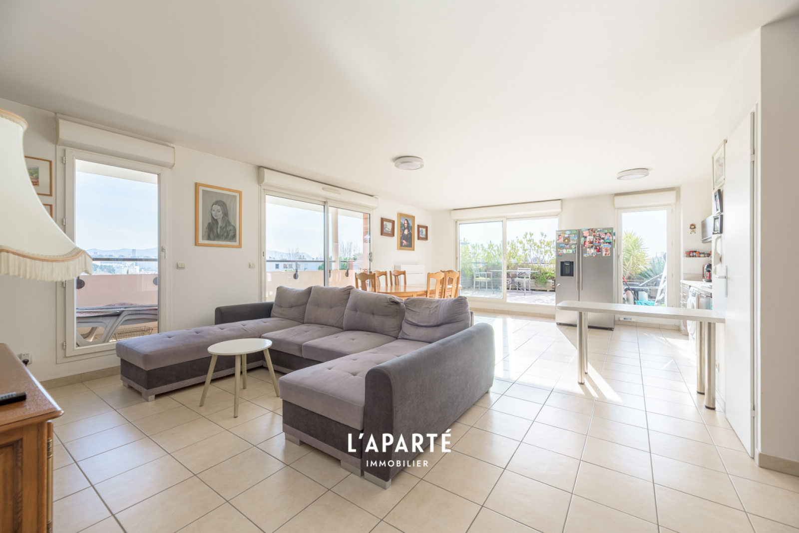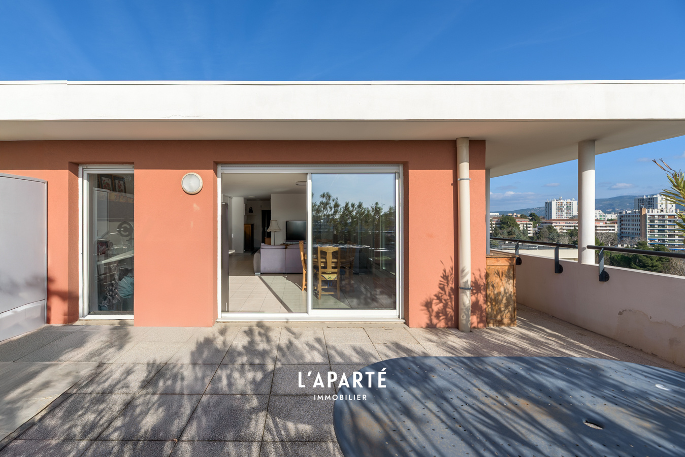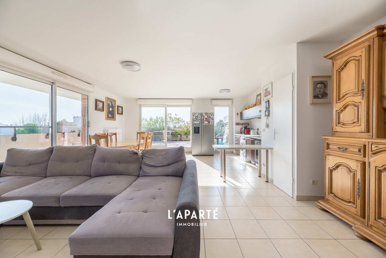 L'aparté vous invite aujourd'hui à découvrir cet appartement T4 de 90m² avec terrasse de 40m2, situé au 4ème et dernier étage d'un immeuble récent, Quartier Saint Mitre.